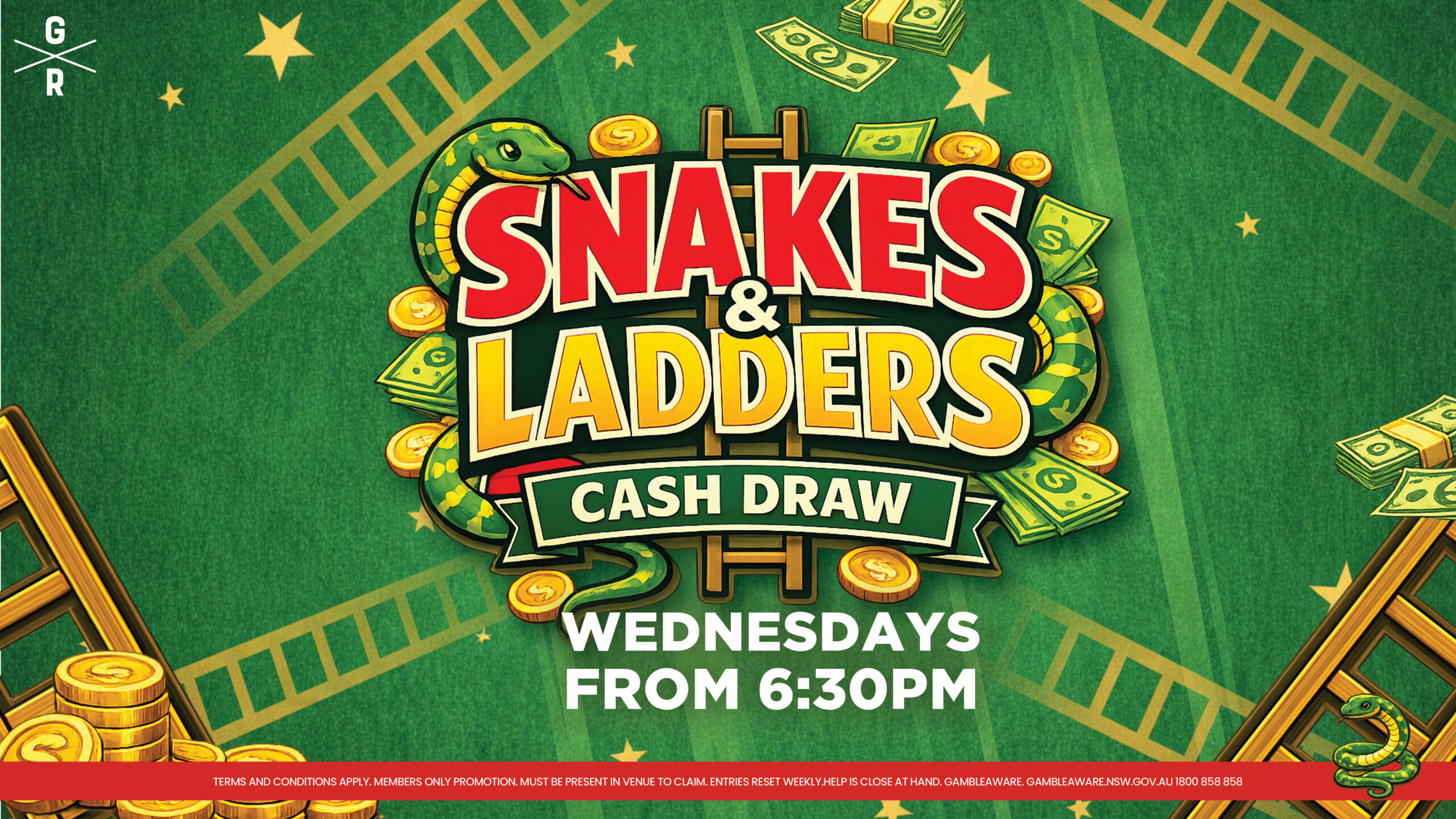 Every Wednesday at 6:30pm & 7:30pm we draw one lucky member! They have 4 minutes to claim their spot or we redraw The winner rolls the dice 3 times on our Snakes & Ladders board (up ladders, down snakes). The total cash amounts they land on = the prize they take home ... Read more »